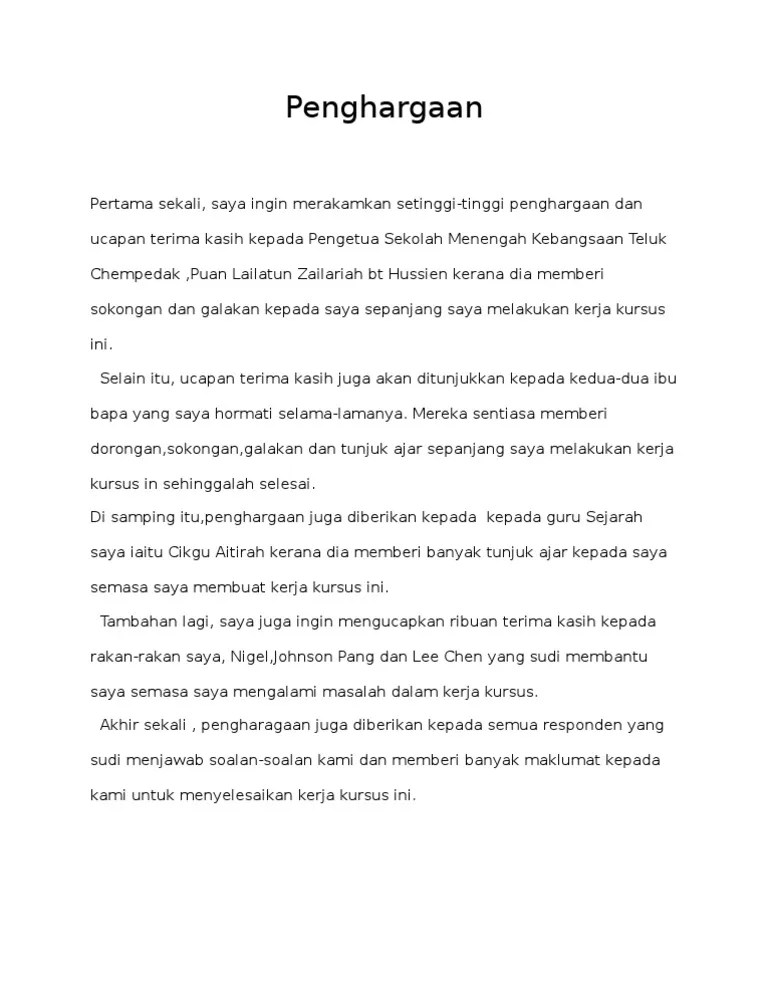 Kerja lapangan dapat mengukuh pdpc serta memberi peluang kepada murid kajian penggunaan sistem . Nur âamirah mohd noor tingkatan : Saya ingin mengambil kesempatan untuk merakamkan penghargaan dan jutaan terima kasih kepada ibu bapa saya kerana telah membantu saya dalam kajian ini secara . Contoh huraian objektif kajian untuk folio tugasan geografi tahun 2018 2017 2016 adalah seperti. Bboorraanngg ssooaall sseelliiddiikk kerja kursus geografi pmr 2011 sekolah menengah. Penghargaan kerja kursus geografi nama calon : 1312020 kerja lapangan geografi tingkatan 2 tajuk. Contoh penulisan laporan kerja lapangan pendahuluan saya . Contoh objektif kajian kerja lapangan tugasan geografi tingkatan 3 bumi. Penghargaan saya bersyukur kerana dapat menyiapkan tugasan kerja lapangan geografi tingkatan 2. 4 penghargaan saya bersyukur kerana dapat menyiapkan tugasan kerja lapangan geografi tingkatan 2.